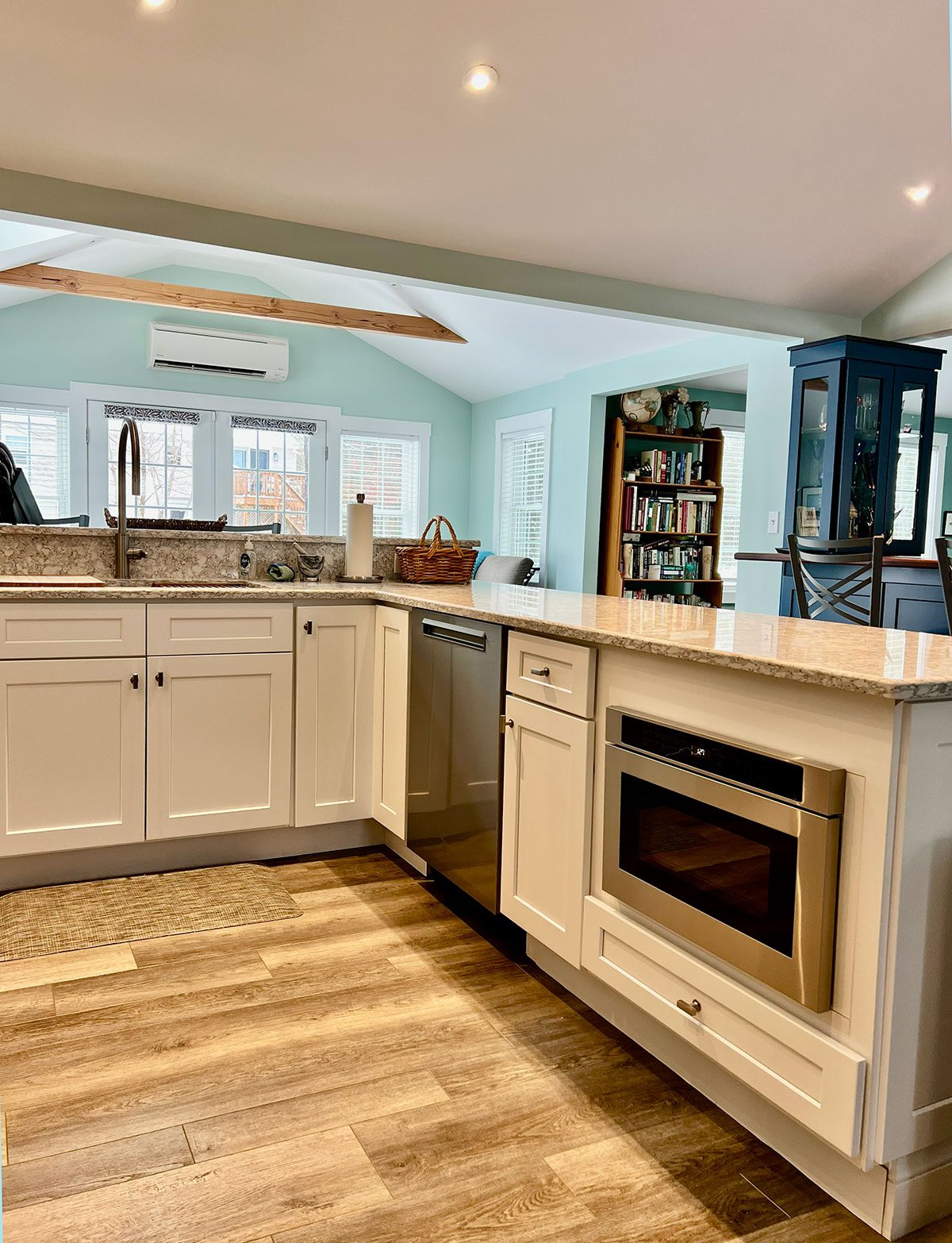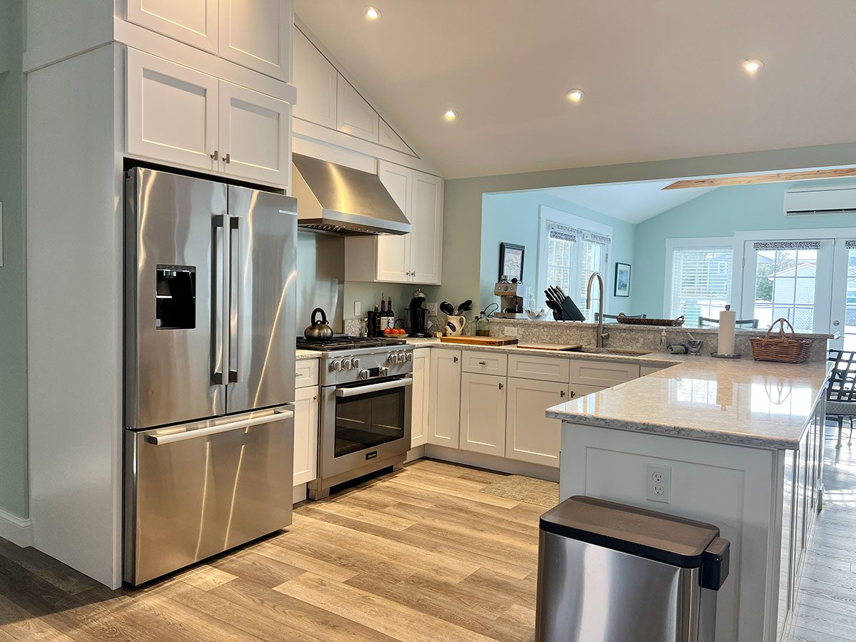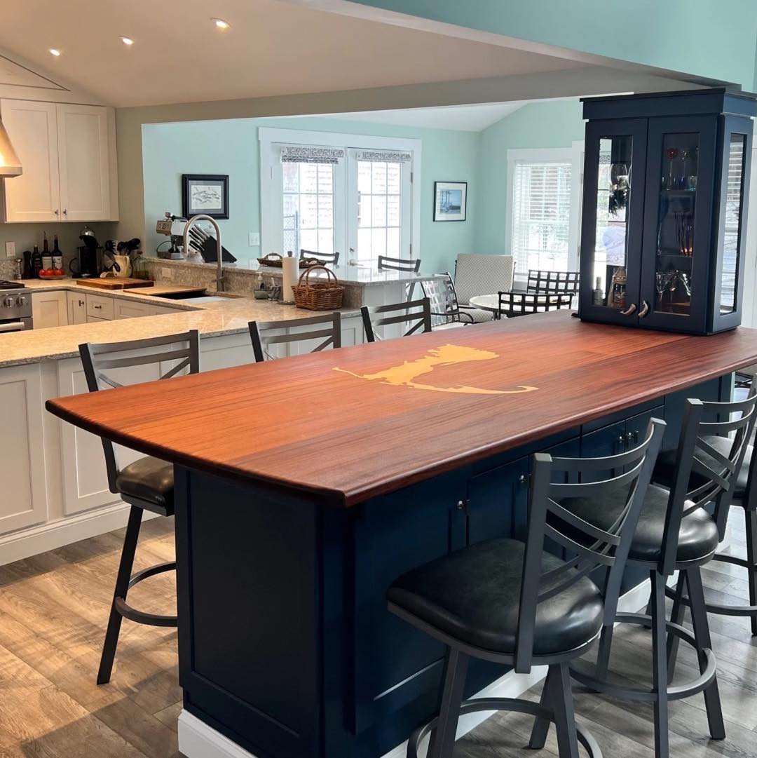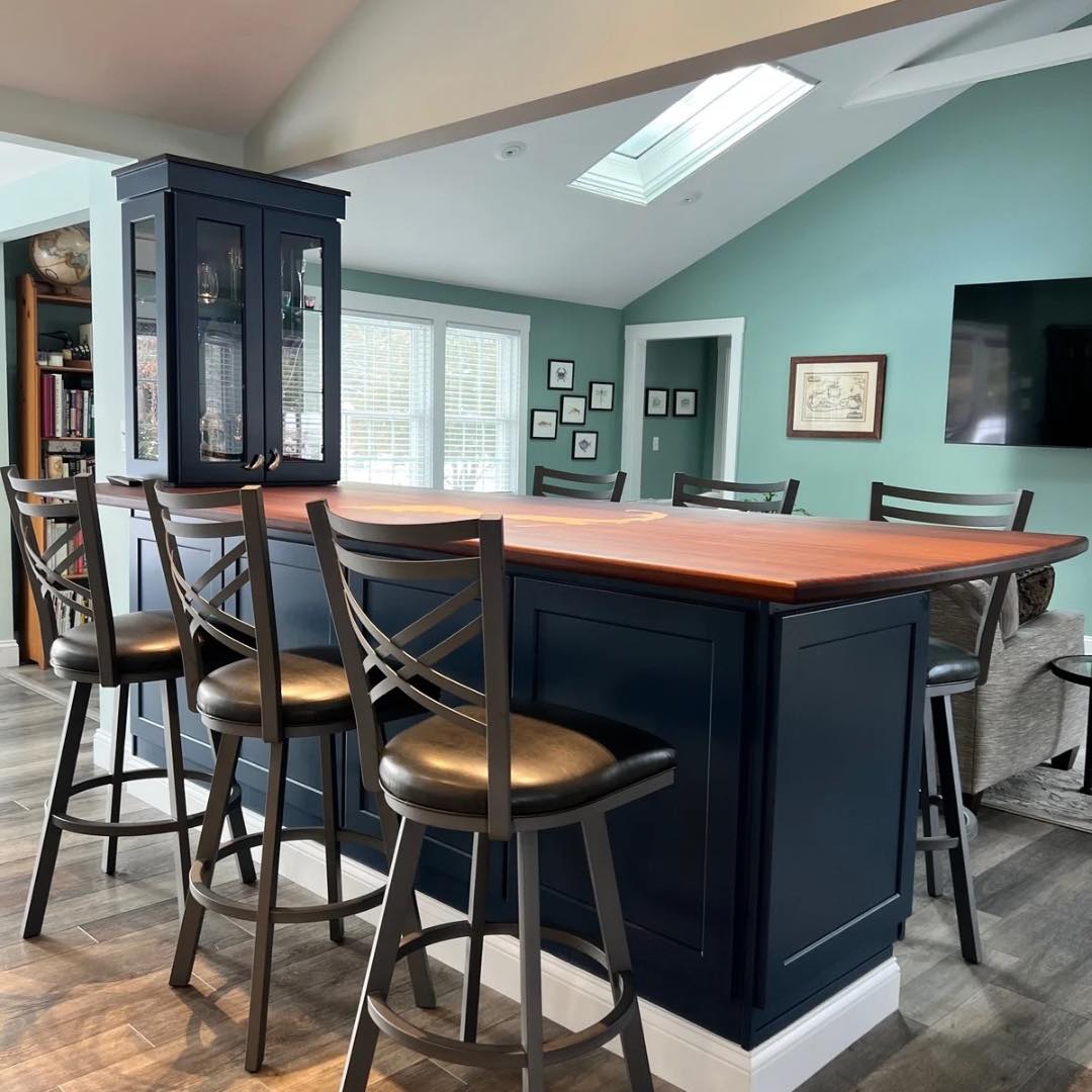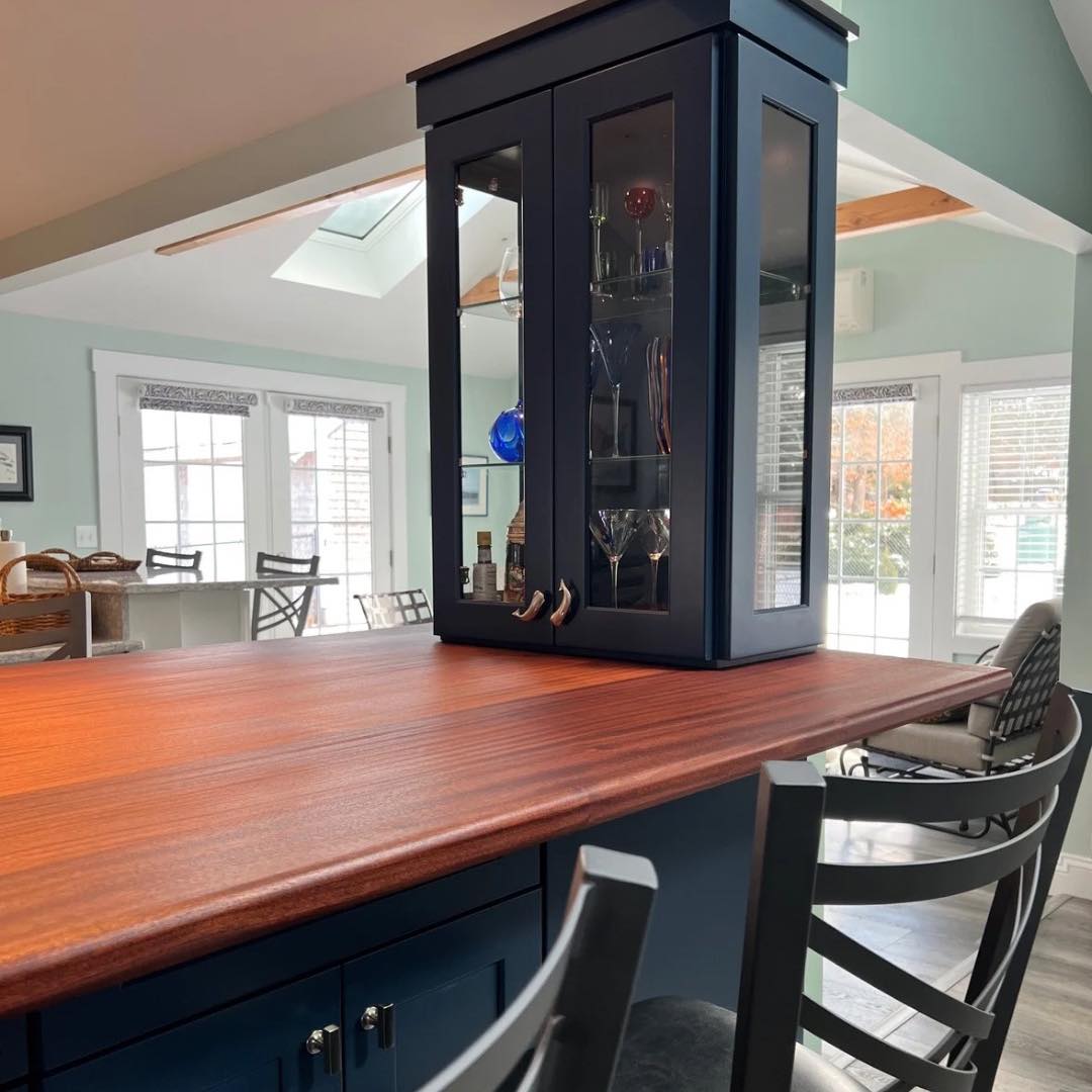 The kitchen features custom cabinetry along with a distinctive bar cabinet area highlighted by a ribbon mahogany bar counter and a Cape-inspired accent crafted in white maple. Flooring throughout the space is random-width Shaker Gray luxury vinyl plank (LVP), adding warmth and durability.