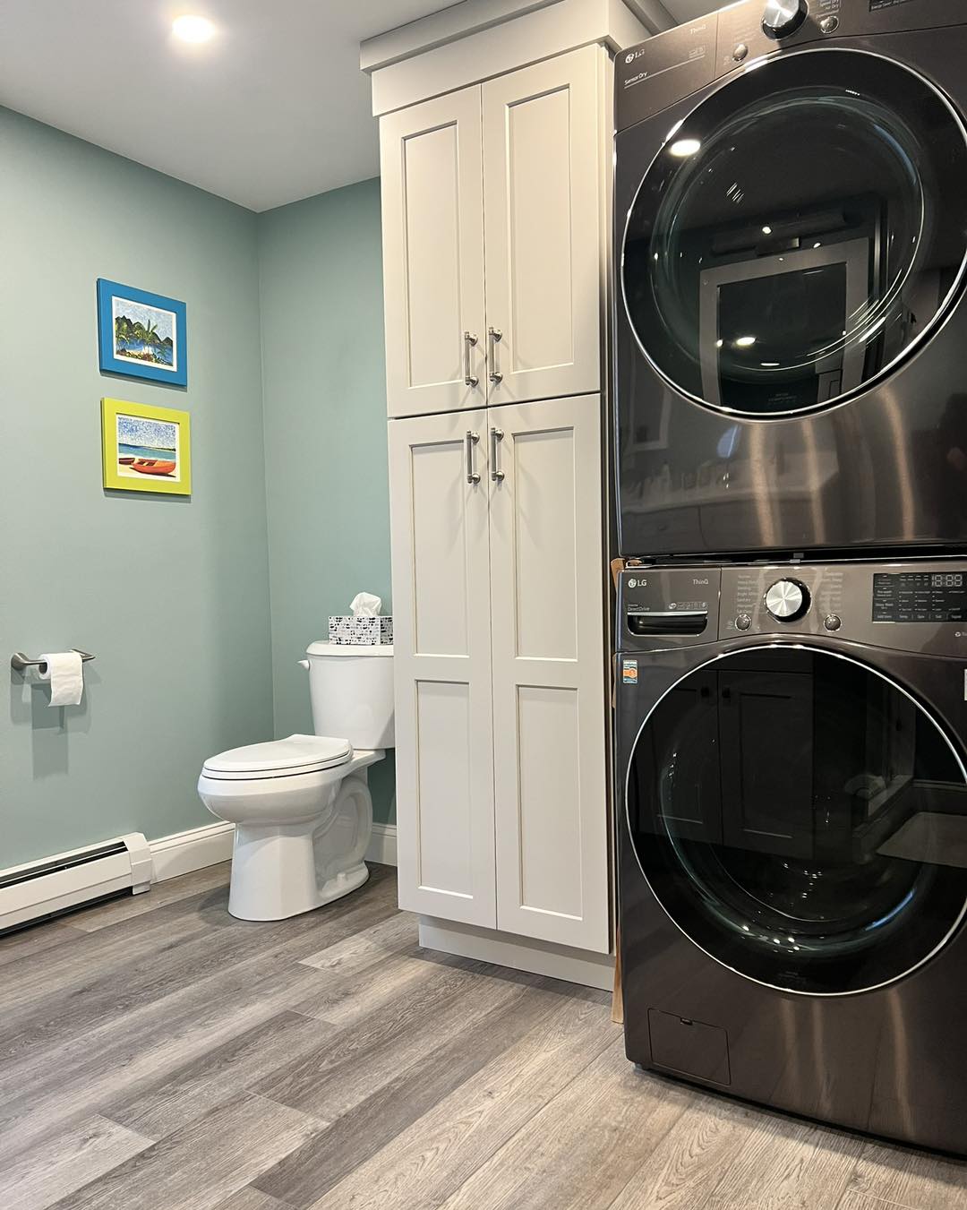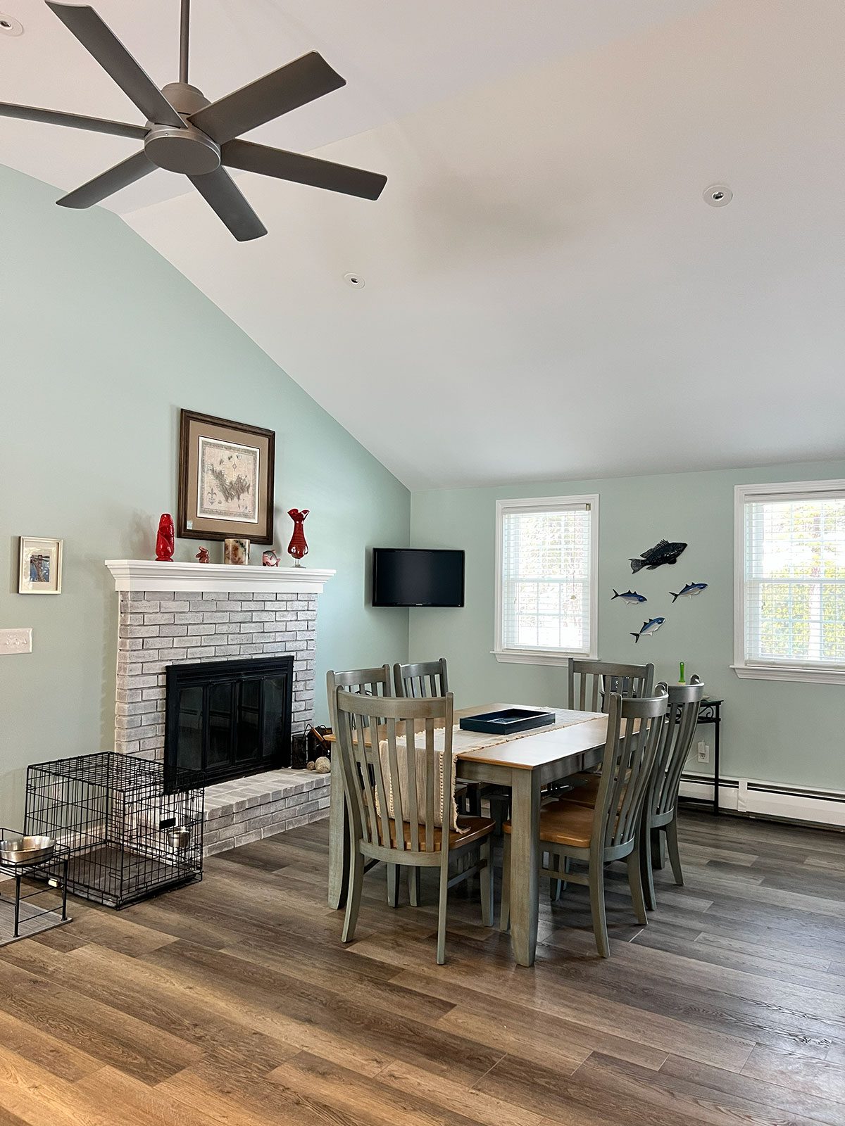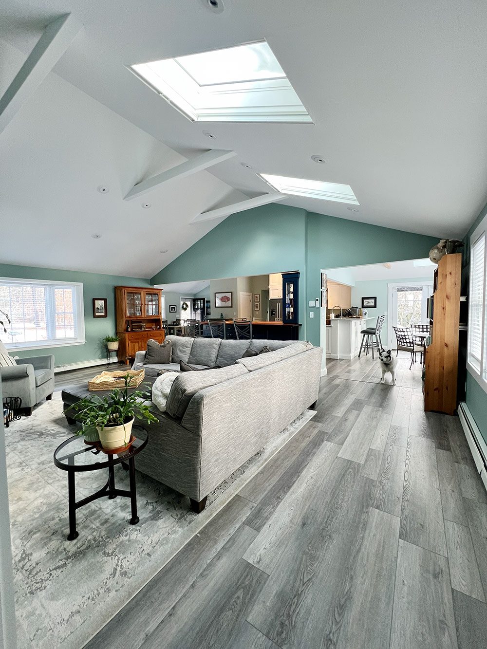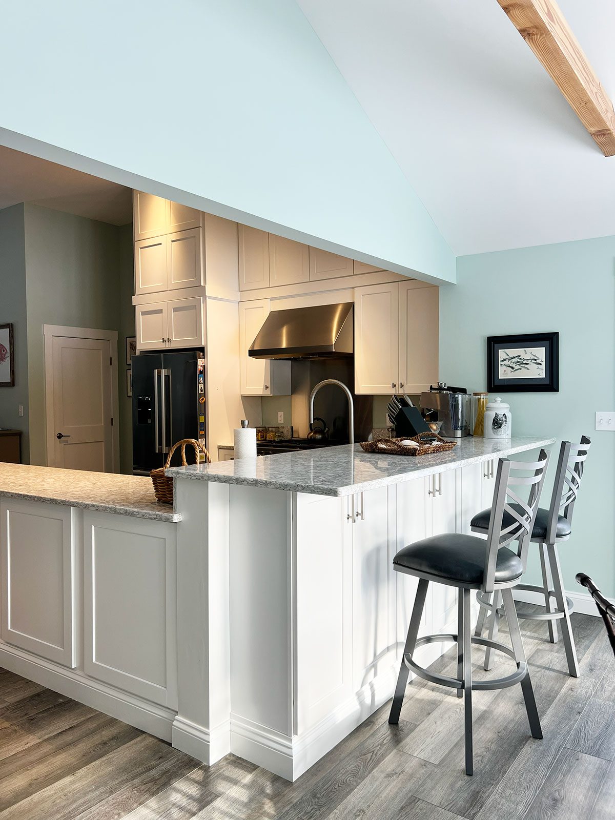 The kitchen features custom cabinetry along with a distinctive bar cabinet area highlighted by a ribbon mahogany bar counter and a Cape-inspired accent crafted in white maple. Flooring throughout the space is random-width Shaker Gray luxury vinyl plank (LVP), adding warmth and durability.