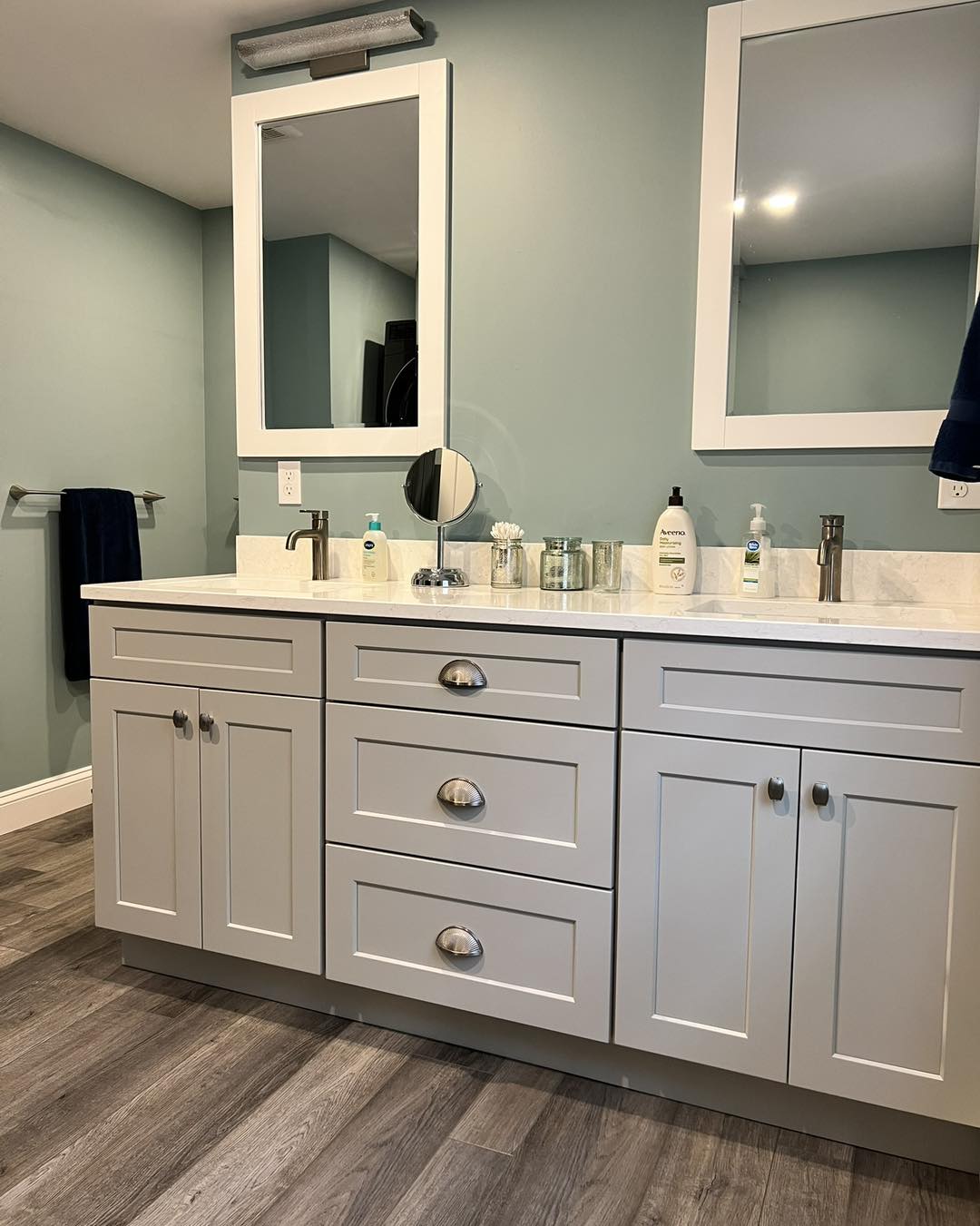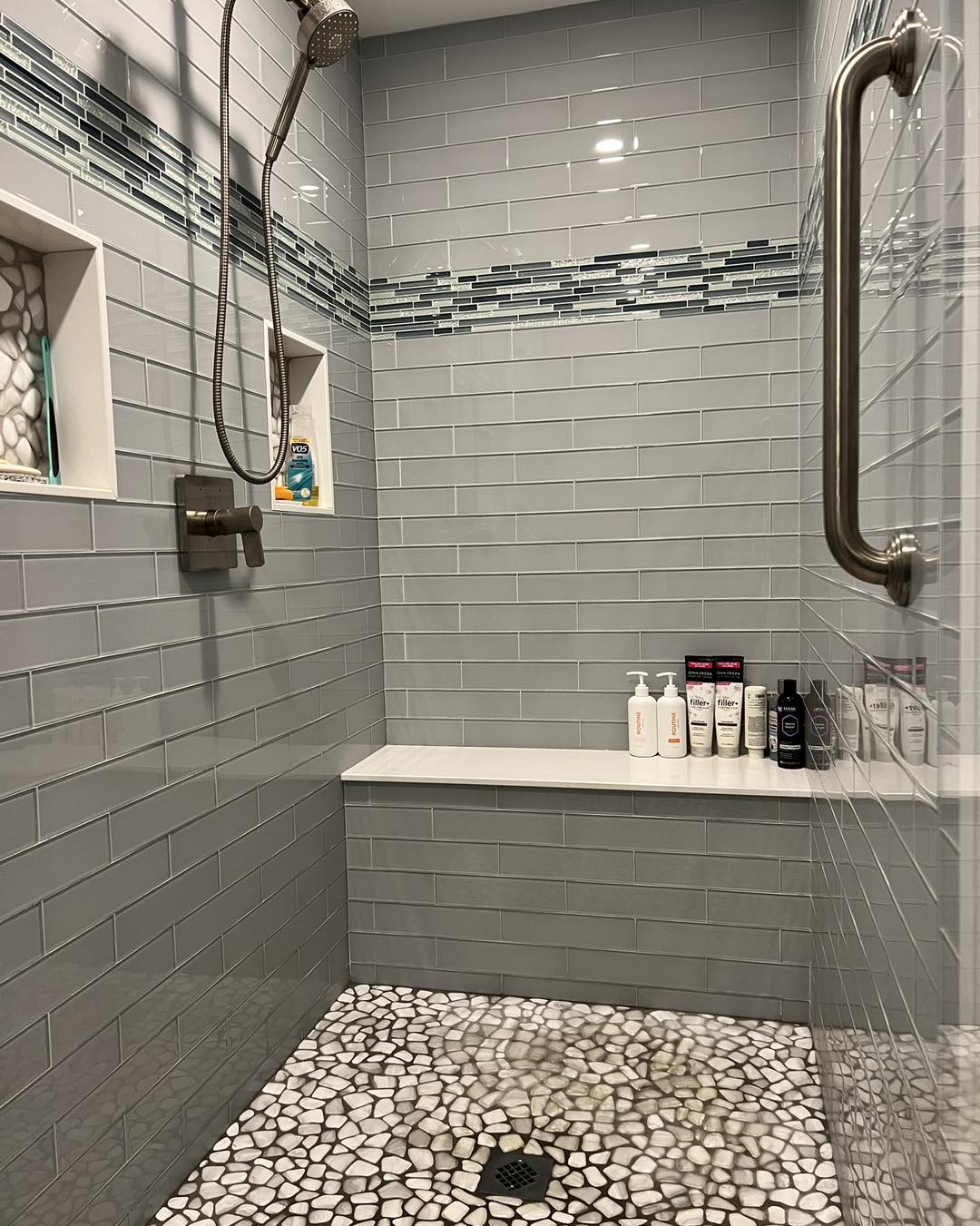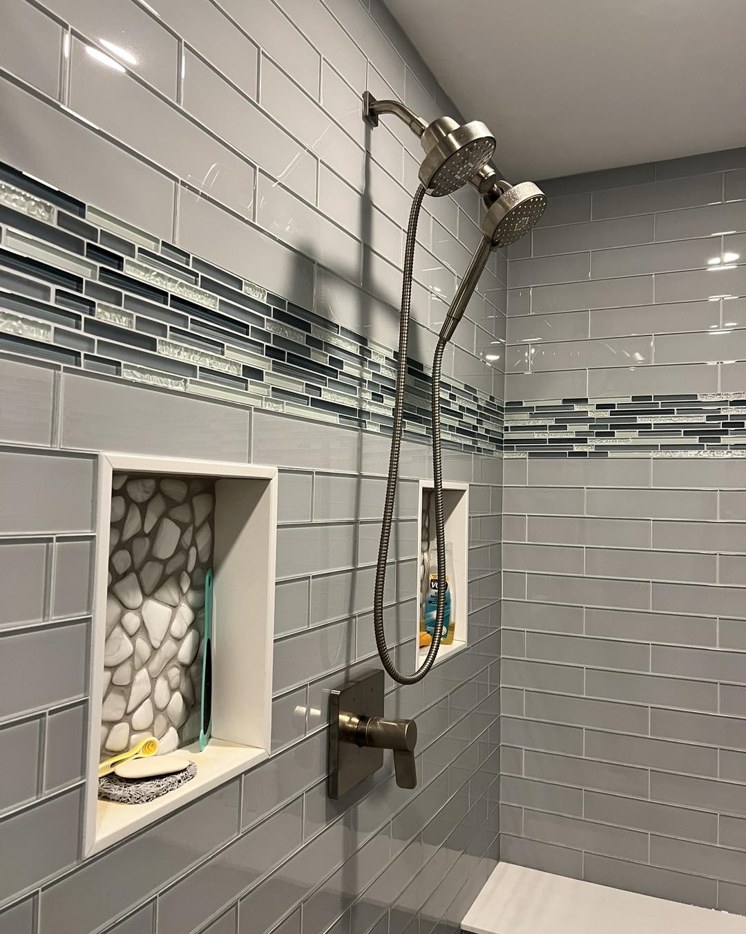 In the primary bathroom, the shower is finished with Oasis glass tile, creating a bright, spa-like focal point.